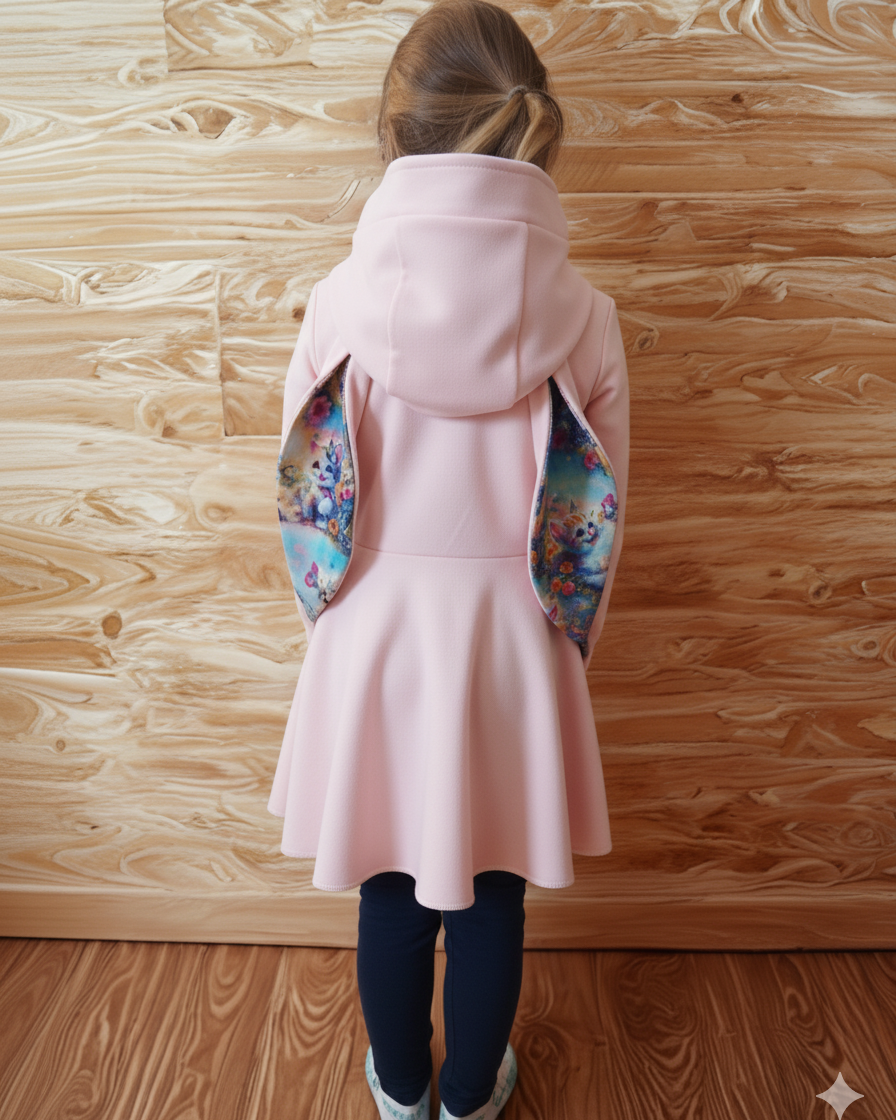 • Kapuce je podšitá nádhernou látkou s květinovým a motýlím vzorem, který se opakuje i na rukávech a dekorativní mašličce v pase.