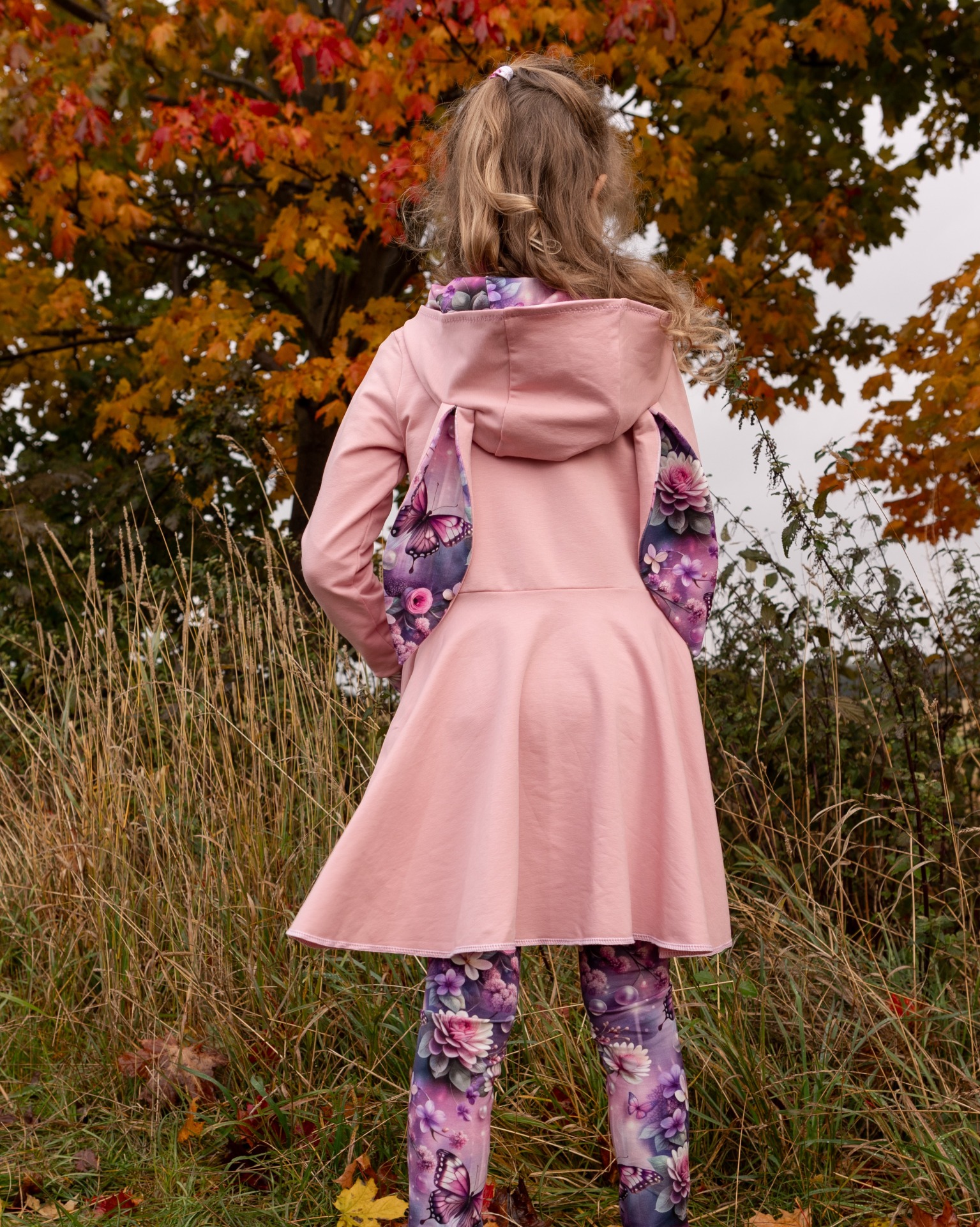 • Kapuce je podšitá nádhernou látkou s květinovým a motýlím vzorem, který se opakuje i na rukávech a dekorativní mašličce v pase.